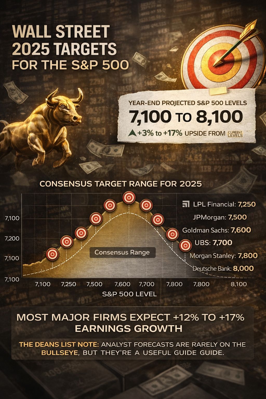 Every December, the strategists publish their year-ahead targets. This year, the consensus clusters around 7,100 to 8,100 for the S&P 500—implying returns of roughly 3% to 17% from current levels.