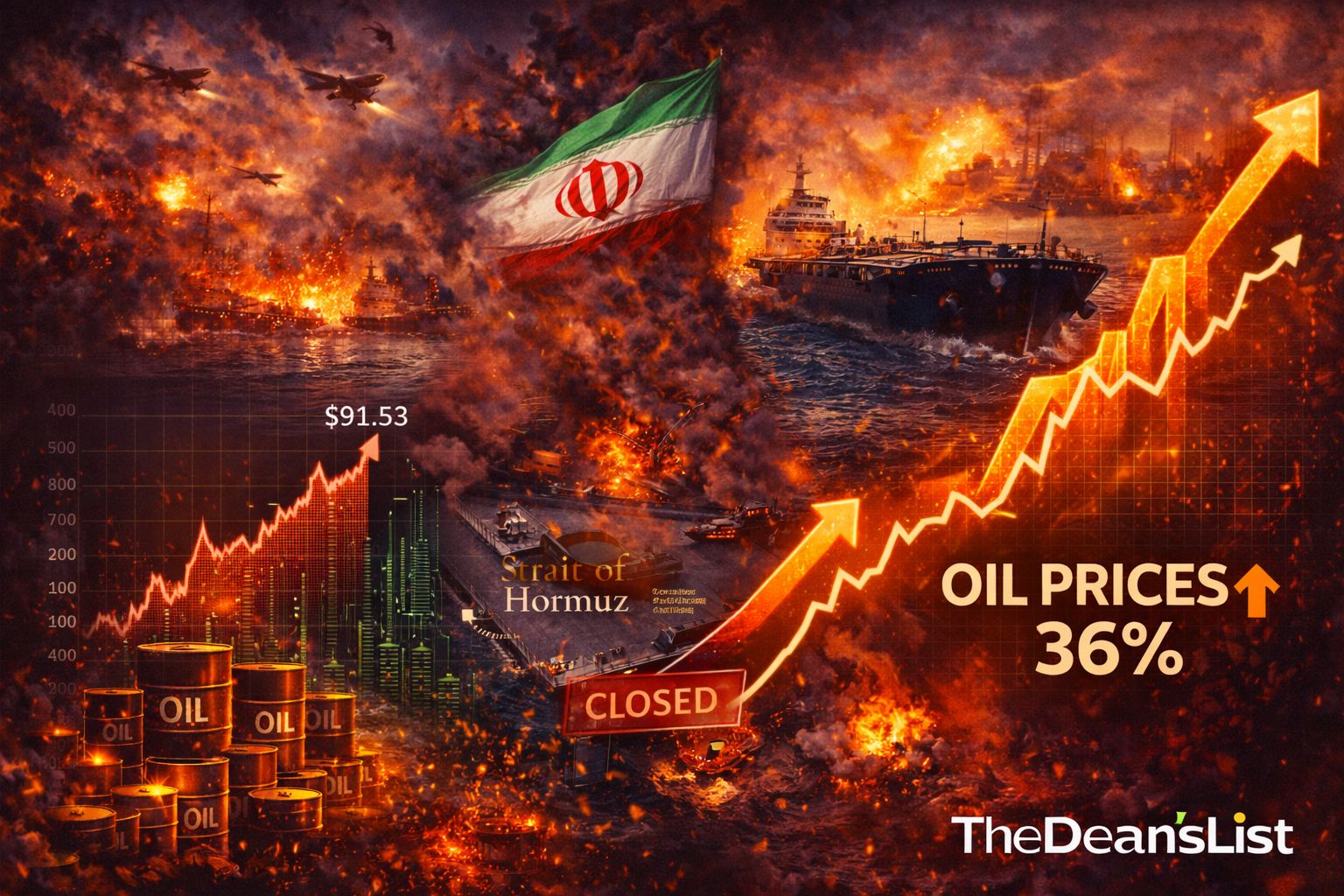 Oil (WTI): ~$91/barrel (+36% for the week—the biggest weekly gain in the history of oil futures dating back to 1983)